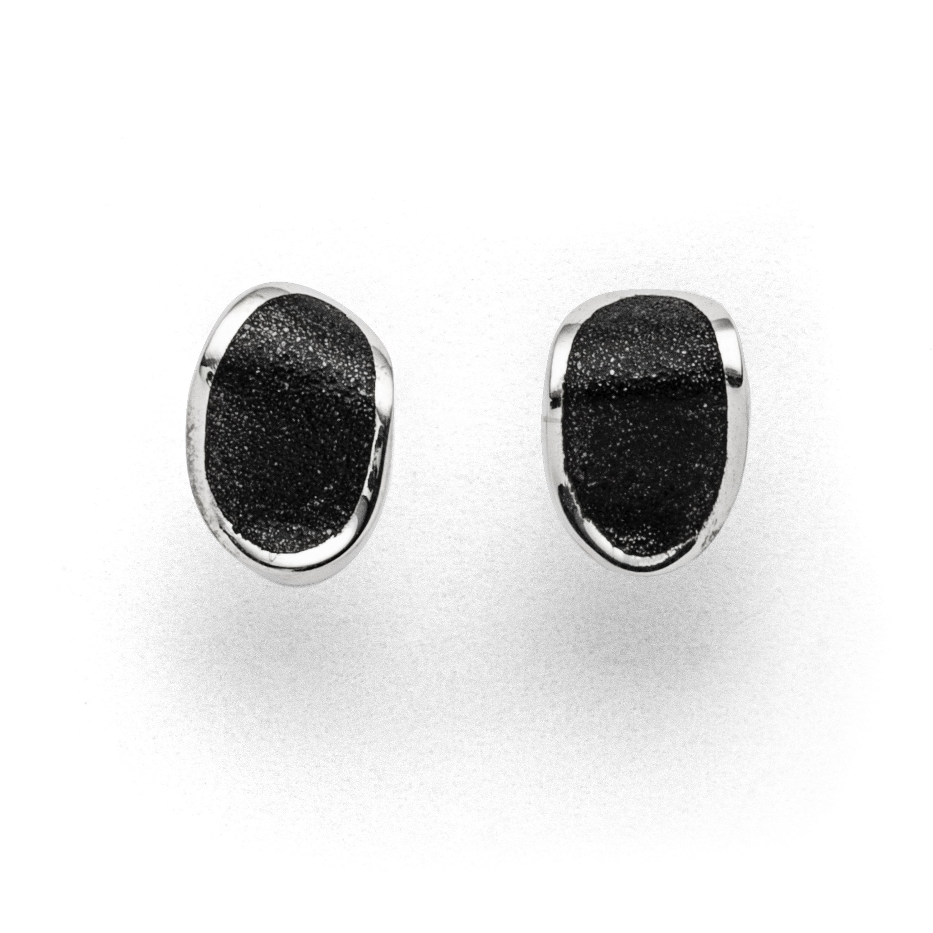 "Lavainsel" ovaler Ohrstecker, geschwungen mit Lavasand gefüllt, aus rhodiniertem 925er Sterlingsilber.