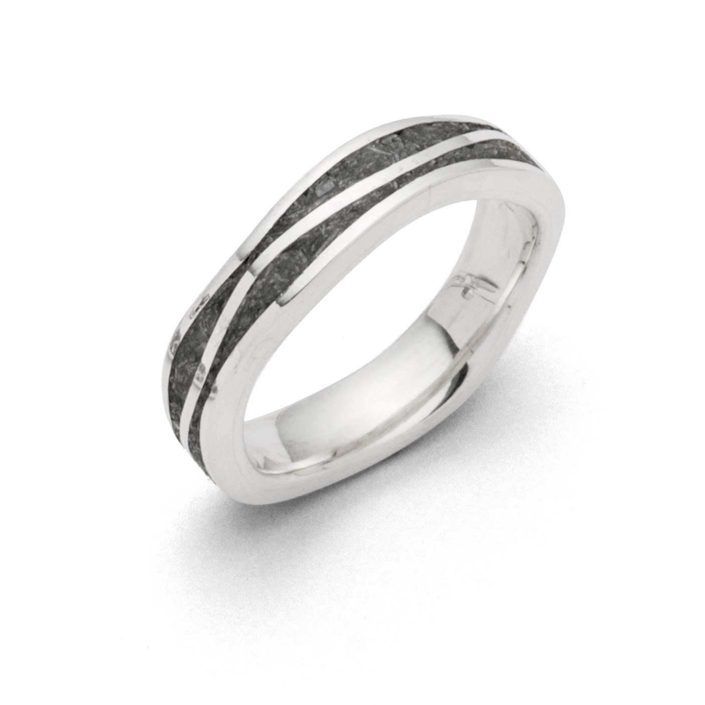 Schmaler, leicht geschwungener Ring "Welle" gefüllt mit grauem Steinsand und gefasst in rhodniertem 925er Sterling-Silber