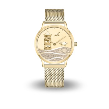 40er DUR Uhr "Pilsumer Leuchtturm" Strandsand, PVD beschichtet, Mesh Band Edelstahl, Farbe: gold