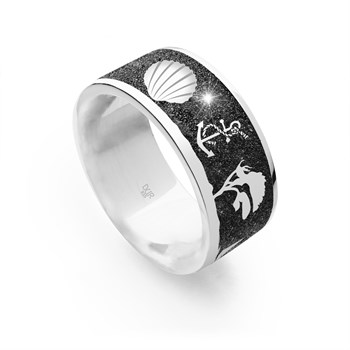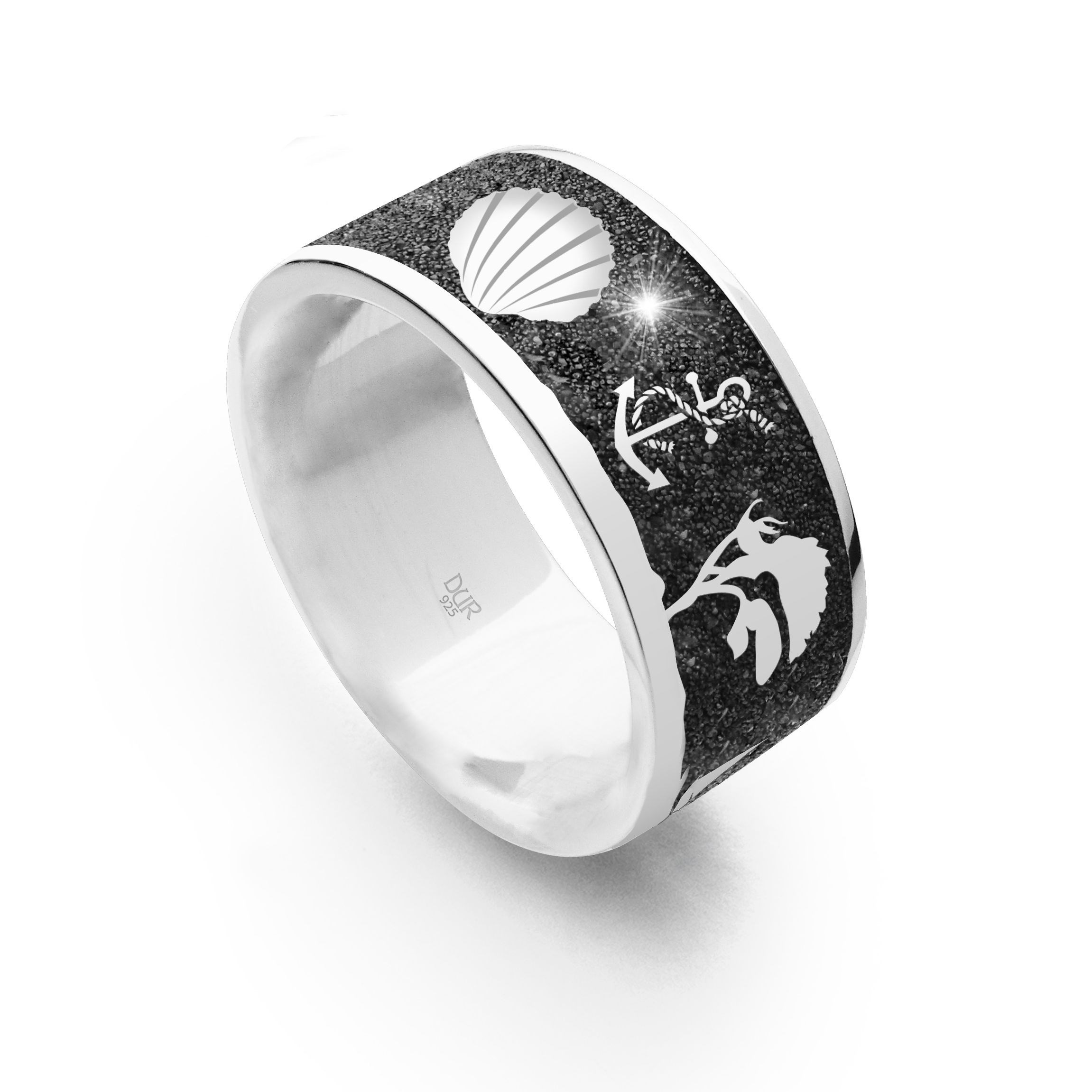 Der glanzvolle Bandring verspricht höchsten Tragekomfort durch hochwertige Materialien und überzeugt durch sein klares Design, sowie eine hohe Symbolik, die ihn für jeden Tragenden einzigartig macht. Auf dem schwarzen Band des funkelnden Lavasands sind formschön verschiedene Motive eingearbeitet (Möwe, Leuchtturm, Strandkorb, Muschel, Anker, Windflüchter, Segelboot), welche die Vielfältigkeit der Ostsee auf zauberhafte Weise einfangen.