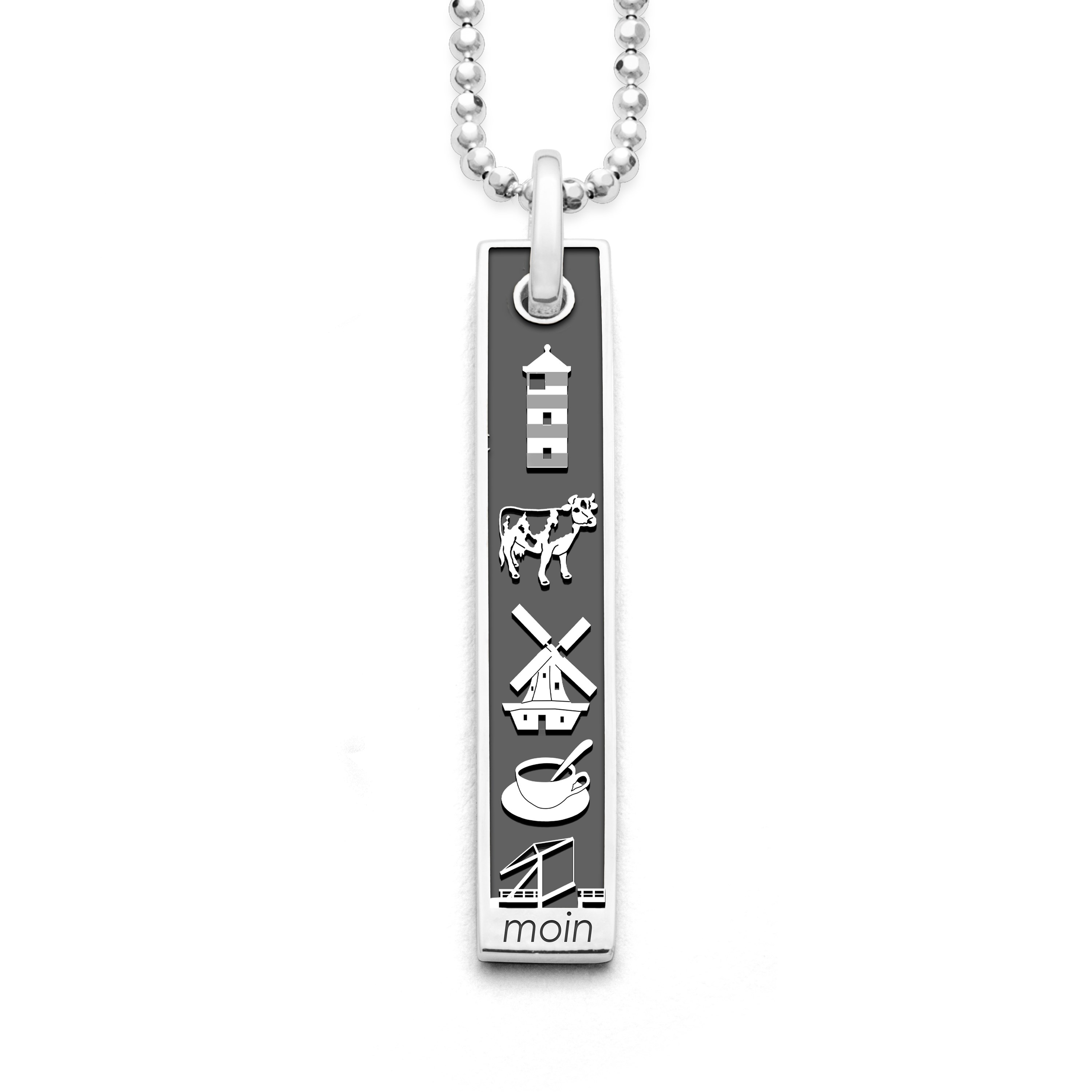 Länglicher Anhänger "Ostfriesland" mit den Motiven: Kuh (Wittmund) - Windmühle (Aurich) - Teetasse (Leer) - Leuchtturm (Pilsum) - Fehnbrücke (Wiesmoor), innen dunkel rhodiniert, alles aus rhodiniertem 925er Sterling-Silber.
