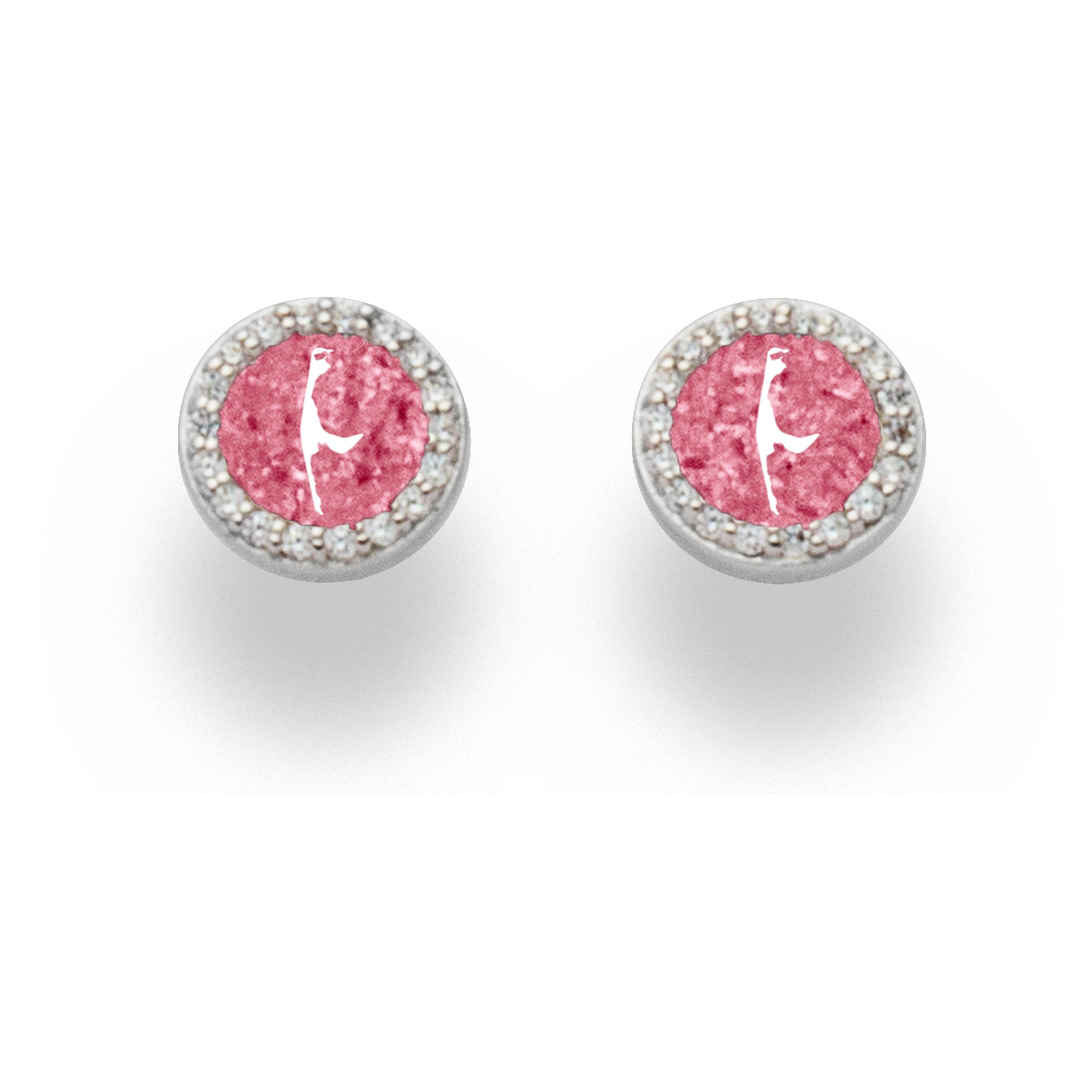 Runder Ohrring "Sylt", mit der Silhouette von Sylt als Motiv, gefüllt mit Rosa Steinsand (Rosenquarz gemahlen) und umrahmt von 36 kleinen Zirkoniasteinen, gefasst in rhodiniertem 925er Sterling-Silber. Durch die Rhodinierung ist das Schmuckstück anlaufgeschützt.